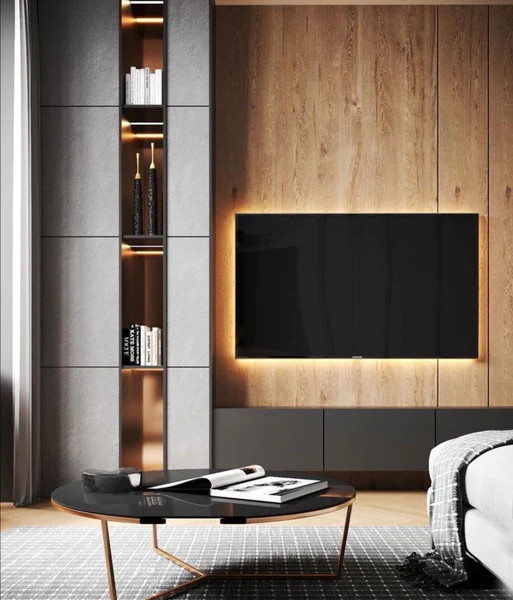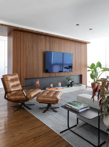 9. LED TV backlight with decorative wood panelling / ห้องนั่งเล่นทันสมัยพร้อมทีวีเรืองแสงและผนังไม้ตกแต่ง