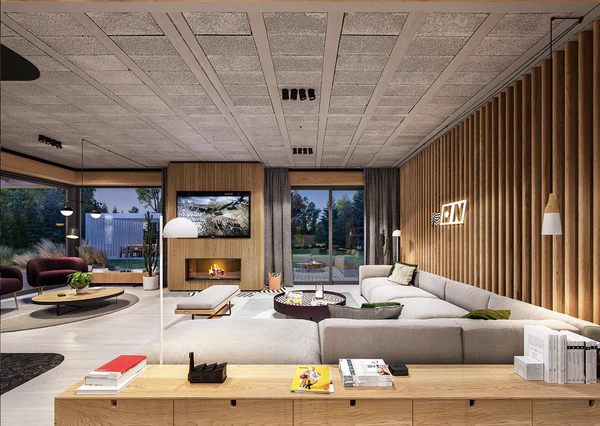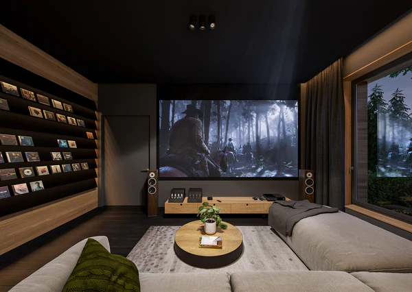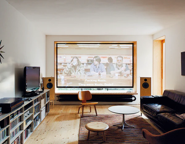 แม้ว่าจะไม่เหมาะกับการชมภาพยนตร์ในเวลากลางวัน แต่การออกแบบห้องนั่งเล่นนี้จะสร้างแรงบันดาลใจให้เกิดความสบายและการสนทนาที่ยอดเยี่ยม