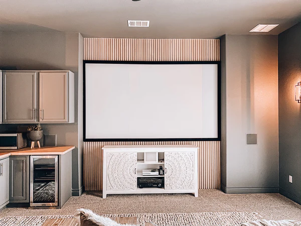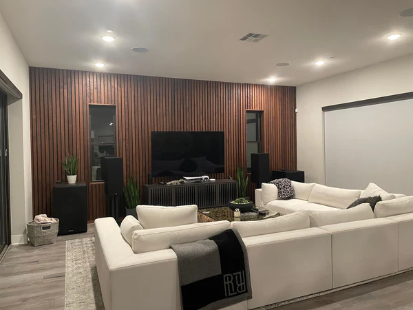 14. Modern farmhouse home theater / การออกแบบห้องนั่งเล่นโฮมเธียเตอร์บ้านไร่ที่ทันสมัยพร้อมผนังไม้ระแนงไม้โอ๊คสีขาว