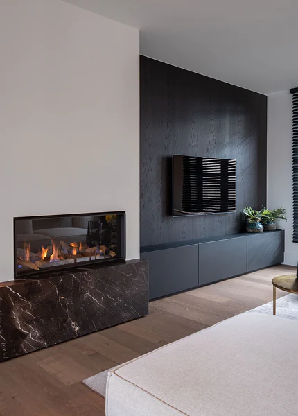 2. ห้องนั่งเล่นสไตล์มินิมอลพร้อมเตาผิงที่ทันสมัย / ห้องนั่งเล่นขาวดำพร้อมเตาผิงและกรุไม้สีดำหลังทีวี