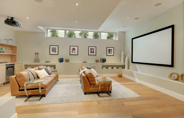 20. Comfy finished basement turned media room / โฮมเธียเตอร์ชั้นใต้ดินที่ทันสมัยสดใสพร้อมโซฟาหนังสีแทนและหน้าจอโปรเจ็กเตอร์ขนาดใหญ่