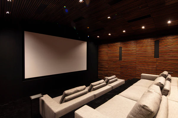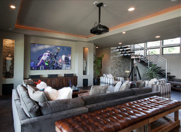 12. Moody mansion home cinema room / การออกแบบห้องโฮมเธียเตอร์สุดหรูพร้อมหน้าจอโปรเจ็กเตอร์และโซฟาแบบแบ่งส่วน