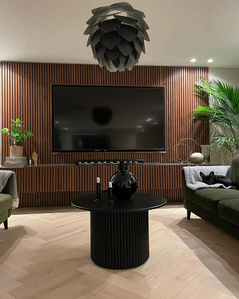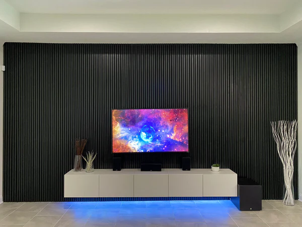 11. ผนังไม้ระแนงไม้สีดำ / โฮมเธียเตอร์ที่ทันสมัยพร้อมไฟ LED ด้านล่างและผนังไม้ระแนงไม้สีดำ
