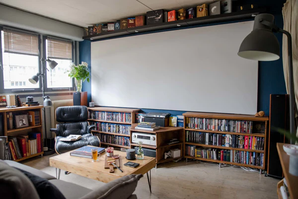 6. การติดตั้งชั้นวางหนังสือและโปรเจ็กเตอร์อย่างมีศิลปะ / ห้องนั่งเล่นศิลปะพร้อมจอโปรเจ็กเตอร์และชั้นวางหนังสือข้างเก้าอี้อีมส์