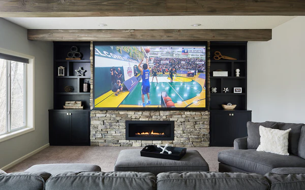 7. Exposed beams for the win / โฮมเธียเตอร์ที่ทันสมัยพร้อมคานไม้เปลือยและจอโปรเจคเตอร์ขนาดใหญ่
