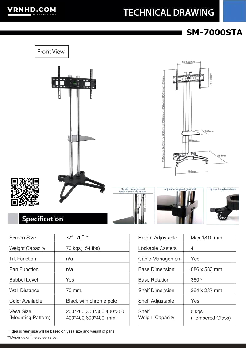 SM-7000STA For TV size 37 - 70, Max VESA 600 x 400 mm, Max Loads 70 kg, Height 1.80m