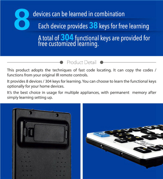 8 in 1 Universal Learning Remote (L800) แก้ความยุ่งยากนี้ได้ โดยเจ้ารีโมทตัวนี้ทำให้คุณสามารถ Copy คำสั่งจากรีโมทที่คุณใช้ประจำได้ถึง 8 เครื่อง (Learning) เก็บไว้ในตัวเดียว เพียงแค่คุณกดเลือกว่าจะสั่ง TV1, TV2, DVD, CD, AV Receiver, SAT, CBL, DVB
