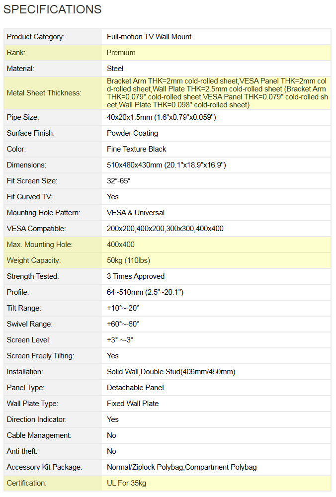 ดีไซน์-การออกแบบ Slim design ตัวชิ้นงานมีลักษณะเป็นสีดำพ่นด้าน (Texture Black Powder Coating surface) ได้อย่างเรียบหรูดูสวยงาม ปรับก้มหน้าจอได้ -20° เงยหน้าจอได้ +10° มีระยะห่างจากผนังถึงหลังทีวีเพียง 64 มม.เมื่อพับเก็บแล้ว และ 510 มม.เมื่อดึงออกมาจนแขนเหยียดสุด สามารถหันไปทางซ้ายหรือขวาได้ ซึ่งการหันไปทางซ้ายหรือขวาจะได้มากหรือน้อยขึ้นอยู่กับขนาดความกว้างของทีวี และที่พิเศษของขาแขวนทีวีรุ่นนี้คือ มันสามารถติดตั้งบนผนังที่มีพื้นแคบสุดเพียง 480 มม.ในแนวนอน และ 204 มม.ในแนวตั้ง. ![]()