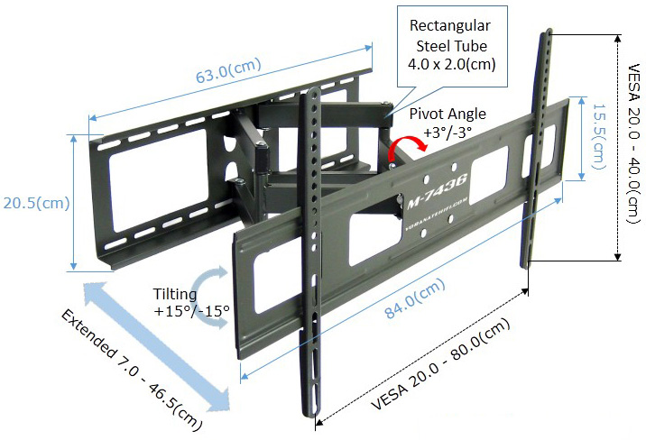M-7436(888) คือขาแขวนทีวีประเภทปรับมุมมองได้ทุกทิศทาง (Full-motion TV Wall Mounts) แบบ 2 แขน (Dual stud Arm) ซึ่งแขนแต่ละชิ้นมีความโตขนาด 40 x 20 มม. (แต่ใช้แผ่นเหล็กที่มีความหนาขนาดเดียวกันทุกชิ้นคือ 1.8 มม. ซึ่งถือว่าไม่ธรรมดา!! ) ขาแขวนประเภทนี้จะมีความมั่นคงแข็งแรงสูงกว่า แบบแขนเดียว (Single stud Arm) มันจึงเหมาะสำหรับใช้แขวนทีวีที่มีขนาดค่อนข้างใหญ่ สำหรับทีวีขนาด 42"- 80" รูยึดขาแขวนด้านหลังทีวี (Max VESA) 200 x 200 ถึง 800 x 400 (มม.) ขณะเดียวกันก็ต้องรักษาความสมดุลย์ (Balance) ของหน้าจอในลักษณะที่ต้องใช้งานในแบบ มองตรง หันทางซ้าย-ขวาอีกด้วย จุดสำคัญของขาแขวนประเภทนี้ อยู่ที่มันมีข้อต่อมากเป็นพิเศษถึง 8 ตำแหน่ง เราจึงต้องทำให้ข้อต่อทั้งหมดนี้ หมุนไปอย่างสัมพันธ์กัน ต้องเที่ยงตรงทั้งแกนในแนวตั้ง และแนวนอน เพื่อรักษาระดับของจอทีวีให้มีความสมดุลย์ (Balance) หรือเสียสมดุลย์น้อยที่สุดในสภาวะที่ต้องแบกรับน้ำหนักของทีวีตลอดเวลา ทั้งในแบบมองตรง หันทางซ้าย-ขวา