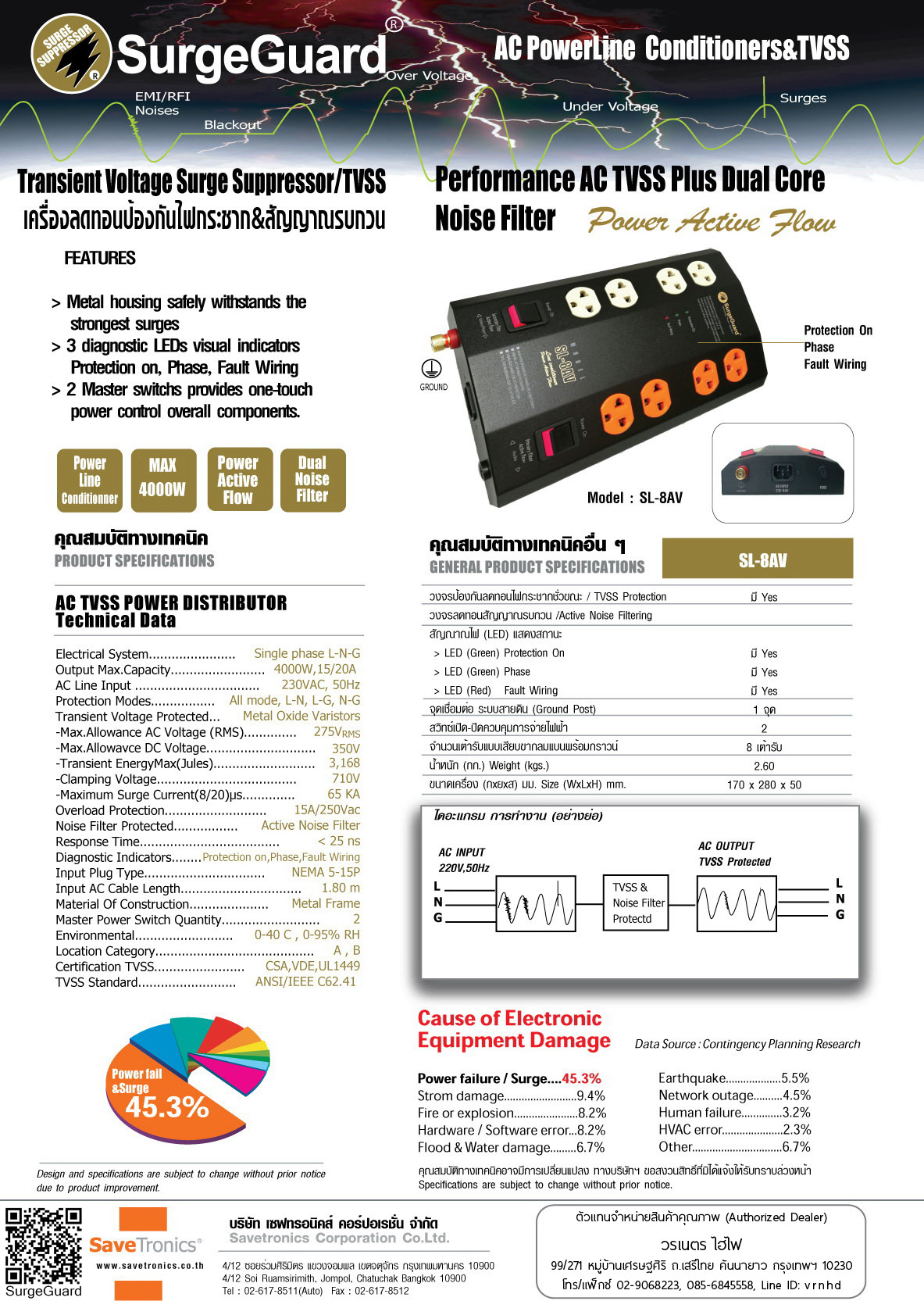 ภายใน SL-8AV ใช้สาย Line, Neutral และ Ground ขนาดใหญ่เพื่อรองรับการจ่ายกระแสไฟได้สูงถึง 20A/4,500 Watts (MAX) SL-8AV ยังทนต่อไฟ้ฟ้ากระชากได้สูงถึง 3,186 จูลล์, หลอดไฟแสดง Protection ON, Phase และ Fault Wiring บนหน้าปัทม์(โดยปกติจะไม่ติด) แต่ถ้าติดขึ้นแสดงว่าให้ตรวจสอบ-แก้ไขปัญหาของ เฟส, ไฟ และกราวด์ ของระบบไฟฟ้าที่เชื่อมต่อ,