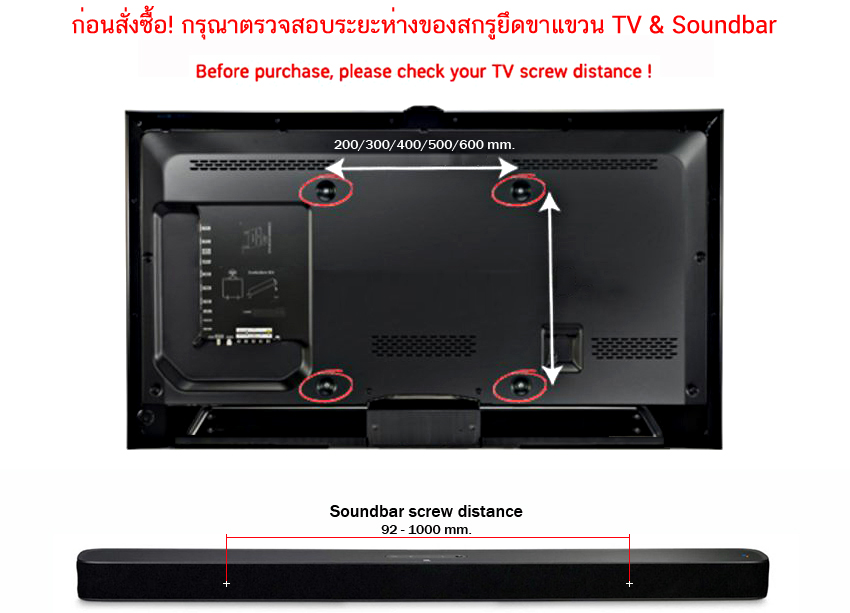 - ระยะมาตราฐาน (VESA) สำหรับรูแขวนลำโพงซาวด์บาร์ตั้งแต่ 92-1,000 มม. (เหมาะกับลําโพงที่มีขนาดต่างกันตามแต่ละยี่ห้อ)