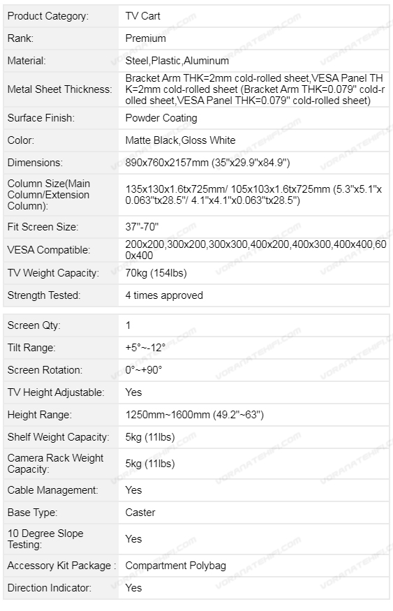 KRATOS-70 comes with an ultra-strong lightweight aluminum column securely attached to an aesthetically pleasing base that together offers the most stable and secure solution for large and heavy displays. Users can easily flip the TV from landscape to portrait orientation or adjust it to remain at any position along the column. The toolless tilting design offers a variety of viewing angles. The cart is easy to move using the built-in D-ring handle while four lockable casters ensure quiet maximum stability along the way. A height-adjustable camera shelf and equipment tray are provided for devices and materials, and the integrated cable management system keeps wiring organized and protected.