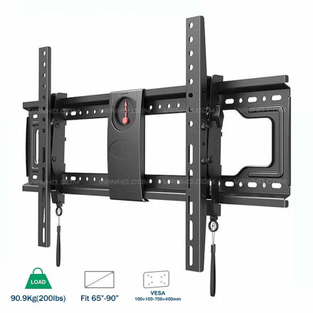 VZ-T7400 ผลิตจากโรงงานในประเทศจีน มาตรฐานส่งออกตลาดโซน US/ EU/ AU ขาแขวนทีวี Extra Slim Large สำหรับทีวีขนาดใหญ่ตั้งแต่ 65 - 90 นิ้ว แบบปรับก้ม-เงยได้โดยไม่ต้องใช้เครื่องมือ สามารถปรับระดับทีวีให้สูงขึ้น หรือต่ำลงได้อีก 3 ช่วงๆละ 30 มม.หลังจากติดตั้งทีวีไปแล้ว, พร้อมด้วยระบบ "click-in spring lock" ล๊อคและปลดล๊อคชุดขาแขวน สำหรับการประกอบทีวีหรือยกออก, Max VESA 700x400 mm., Weight Capacity 90.9 kg., ระยะห่างจากผนัง 70 มม.