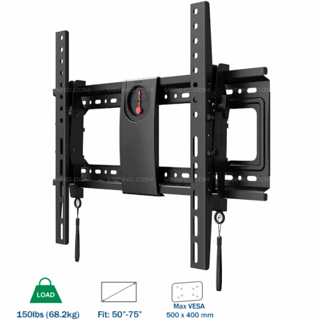 VZ-T5400 ผลิตจากโรงงานในประเทศจีน มาตรฐานส่งออกตลาดโซน US/ EU/ AU ขาแขวนทีวี Extra Slim Large สำหรับทีวีขนาดใหญ่ตั้งแต่ 55-75 นิ้ว แบบปรับก้ม-เงยได้โดยไม่ต้องใช้เครื่องมือ สามารถปรับระดับทีวีให้สูงขึ้น หรือต่ำลงได้อีก 3 ช่วงๆละ 30 มม.หลังจากติดตั้งทีวีไปแล้ว, พร้อมด้วยระบบ "click-in spring lock" ล๊อคและปลดล๊อคชุดขาแขวน สำหรับการประกอบทีวีหรือยกออก, Max VESA 500x400 mm., Weight Capacity 68.2 kg., ระยะห่างจากผนัง 70 มม.