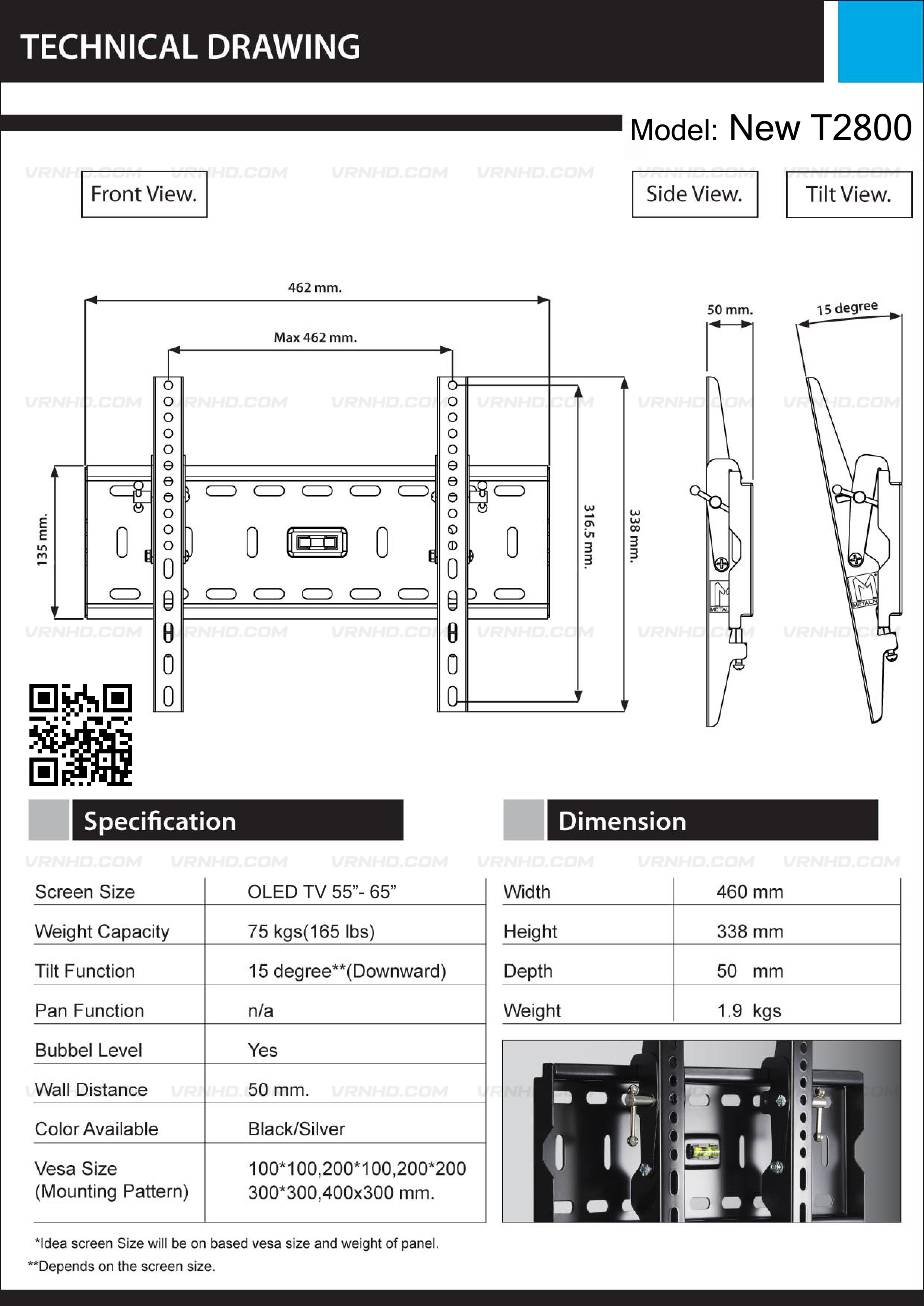 สำหรับ OLED TV ขนาด 55-65 นิ้ว Panasonic, LG, Sony ปรับก้มหน้าจอได้ 15° รองรับน้ำหนักได้สูงสุด 75 Kg ระยะห่างจากผนัง 50(mm), Max VESA 400x300(mm)