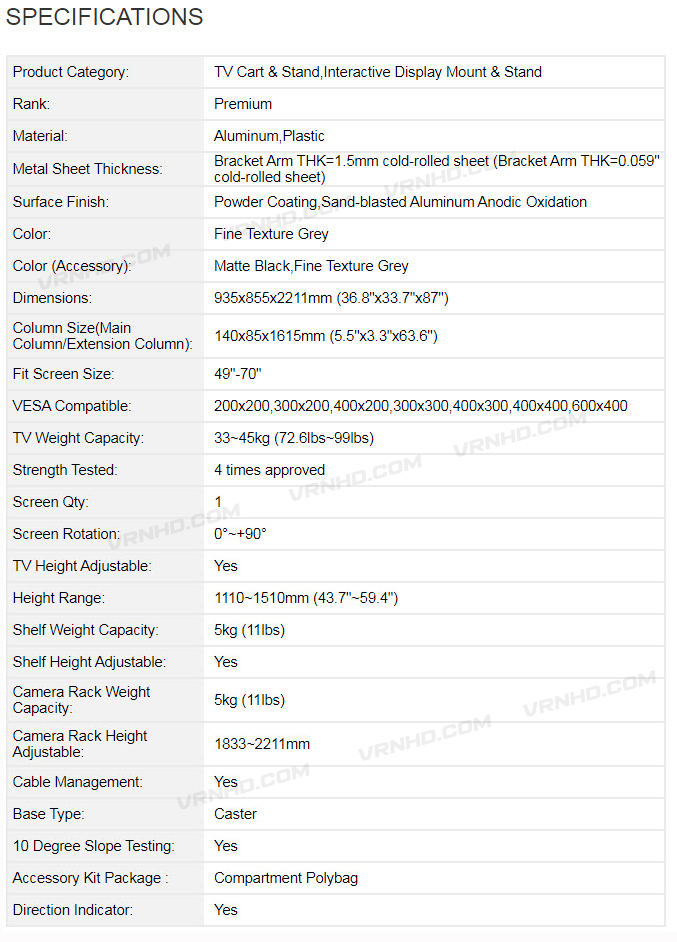 Looking for a mobile TV cart that’s capable of handling larger and heavier display can be troubling - well not anymore! We’ve specially designed the F9350C to handle displays from 49-70 inches and the ability to easily hold up to 45kg/90 pounds! Features include freely switching portrait-to-landscape rotation and 15.7" (400mm) effortless height adjustment. Don’t hesitate, you just found the TV cart you’ve been looking for! Features;