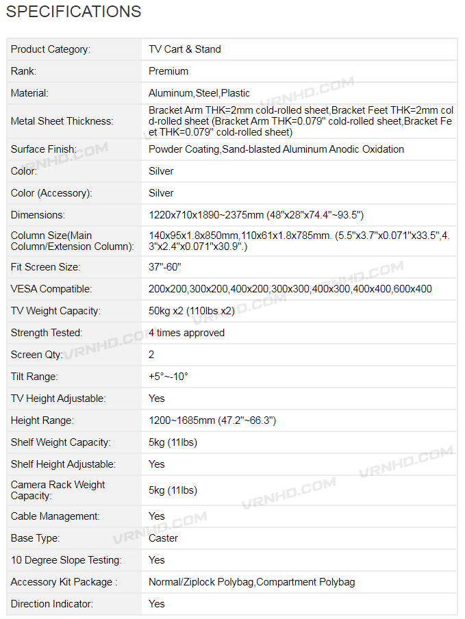 F9600D ผลิตจากอะลูมิเนียมคุณภาพสูง น้ำหนักเบา ออกแบบมาให้การประชุมทางไกลเป็นเรื่องง่าย ใช้ได้กับจอ LCD, LED TV และ Video Wall ขนาด 37”-60” สามารถรองรับน้ำหนักได้สูงสุด 50 กก./จอ มีหูจับ D-ring สะดวกสำหรับการเข็นย้าย, ติดตั้งแบบ 2 จอภาพ พร้อมชั้นวางเครื่อง DVD, STB มีล้อเลื่อน และฐานขนาดใหญ่แข็งแรงเพื่อความมั่นคง ความปลอดภัยในการเข็นย้าย ปรับระดับความสูง-ต่ำของขาตั้งจอได้ F9600D เป็นตัวเลือกที่สมบูรณ์แบบ สำหรับห้องประชุม งานแสดงสินค้า โรงพยาบาล ห้องเรียน ห้องบรรยาย โรงแรม บาร์ และโรงยิม