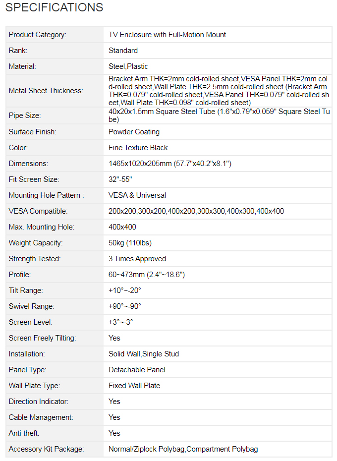 The WTV-55 is an affordable alternative for watching a conventional TV outside instead of purchasing an expensive outdoor TV. The protective enclosure offers effective rain/wind/UV/vandal resistance, preventing the TV from any damage. Open the front enclosure, there is a full-motion mount included for perfect viewing no matter how lighting changes. When the TV is in use, hooks below the TV mount can hold the front panel easily. When the TV is not in use, 2 padlock holes are designed to prevent the TV from theft (locks required). The component design makes assembly and shipping easy.