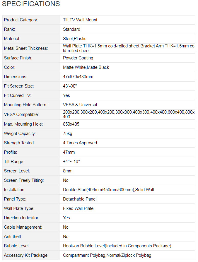 UHT-777 is a tilting TV mount that can hold your large TVs up to 90'' in size and 75kg/165lbs in weight firmly. There are leveling adjustments and a quick-release spring lock on the TV mount, which are indeed user-friendly in installation. Users can also fine tilt the mount from +4°~-10° without tools. Features: