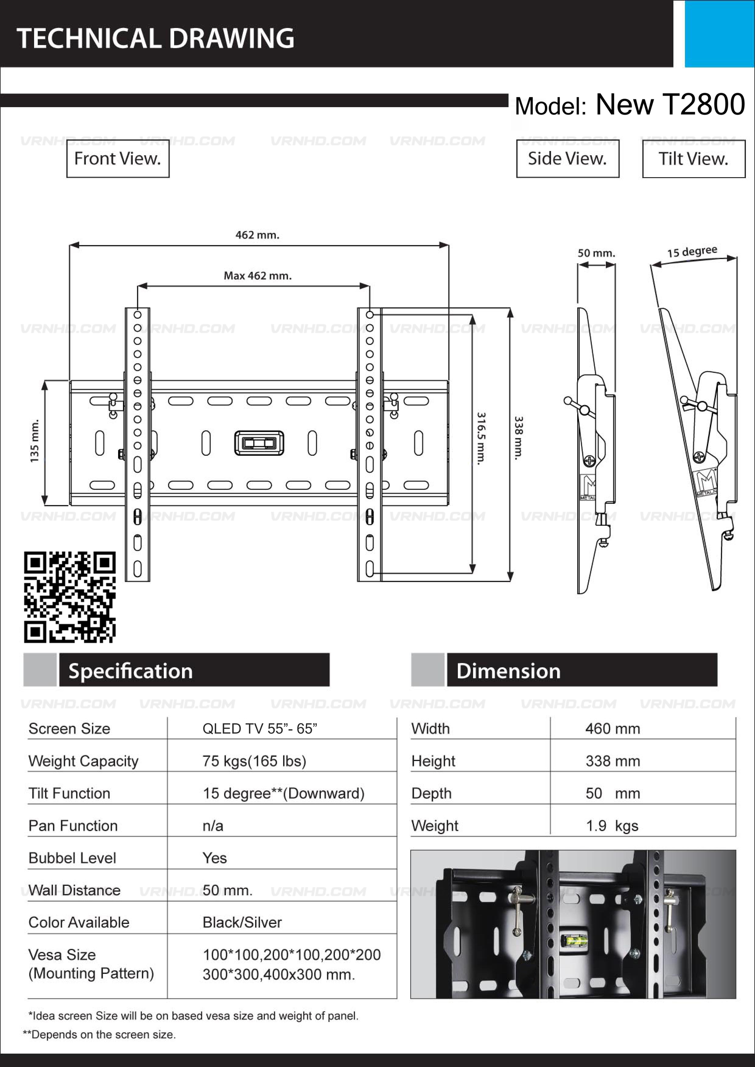 สำหรับ SAMSUNG QLED TV ขนาด 55-65 นิ้ว ปรับก้มจอได้ 15° รองรับน้ำหนักได้สูงสุด 75 Kg ระยะห่างจากผนัง 50(mm), Max VESA 400x300(mm)