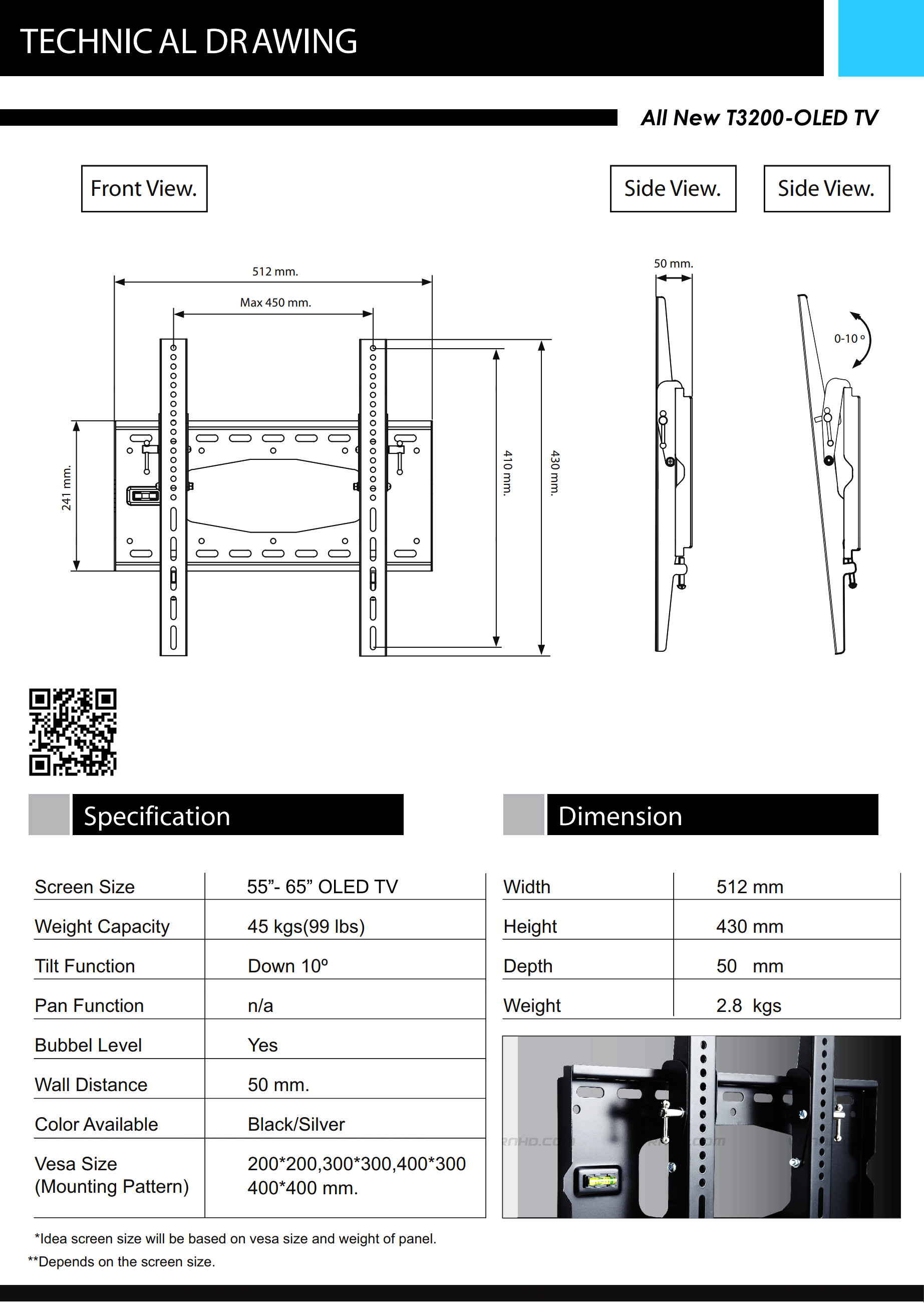 สำหรับ OLED TV ขนาด 55-65 นิ้ว Panasonic, LG, Sony ปรับก้มหน้าจอได้ 15° รองรับน้ำหนักได้สูงสุด 45 Kg ระยะห่างจากผนัง 50(mm), Max VESA 400x400(mm)