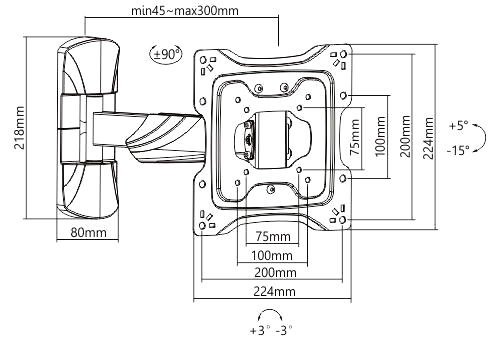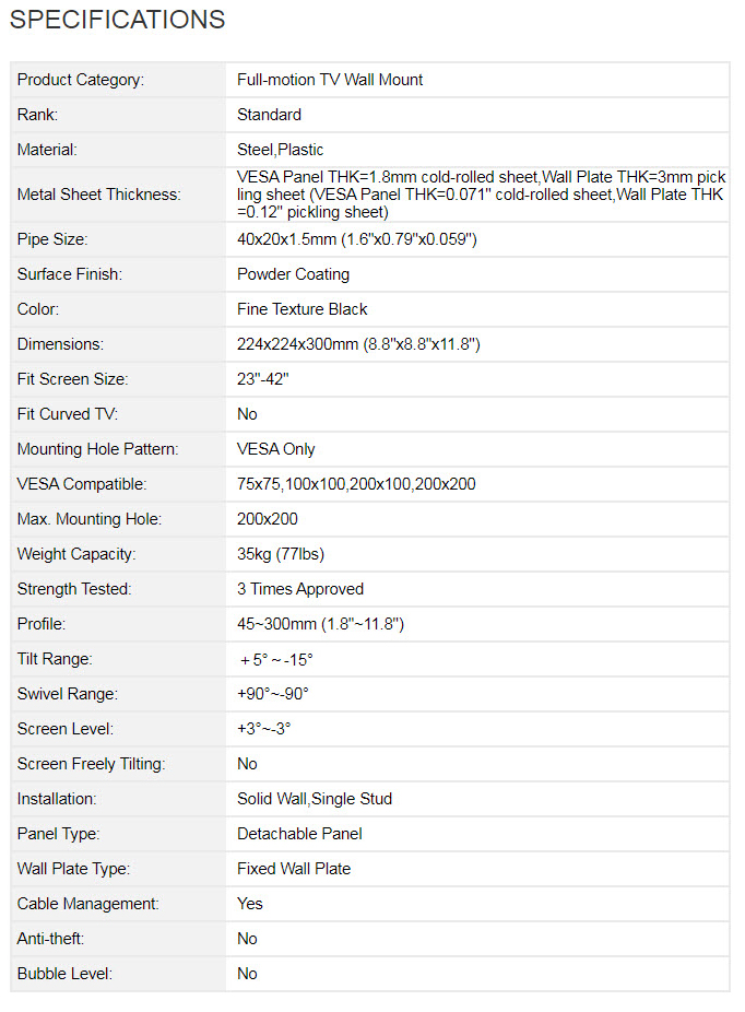 New A3650 is a full-motion wall mount for most 23''- 43'' LED, LCD flat panel TVs up to 35kg/77lbs. The arm can be stretched up to 300 mm. for a full range of movement to perfectly position your screen display - swivel up to 90° left or right and -15°~+5° tilt. This pre-assembled arm comes complete with integrated cable management and decorative covers to ensure an elegant and tidy look. Its built-in level adjustment offers 3° clockwise and counterclockwise turning to ensure it is perfectly level. Compatible with VESA hole up to 200x200 mm.