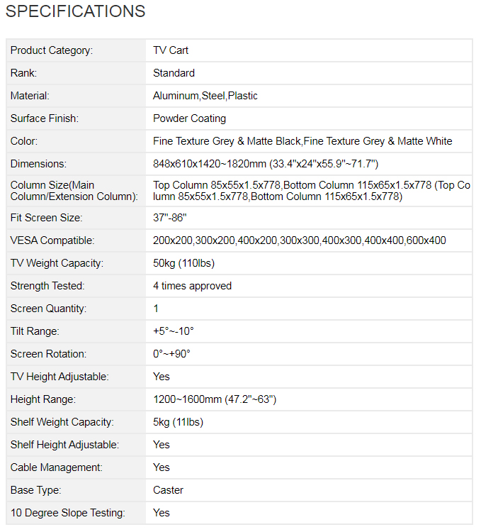 Bring the TV to you. When it needs to be somewhere else, move it there with ease. The MH-F3786 Aluminum Height-Adjustable Multimedia TV Cart puts the TV on wheels so you can take it to different spaces as needed, avoid an annoying glare, or overcome a restrictive furniture setup. VESA-compliant and constructed of quality aluminum materials, this well-made, heavy-duty rolling TV stand supports TVs up to 86" and can support a total weight up to 50 kg (110 lbs.).