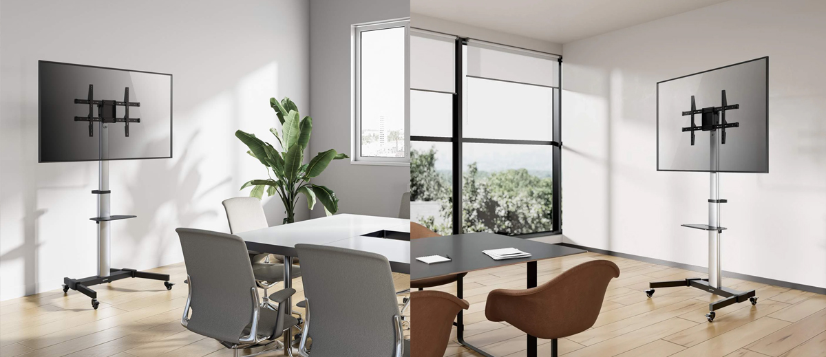 This Heavy-duty TV stand on wheels is ideal for residential, office, hospitality, classroom and conference room, and other commercial purposes. It's an excellent choice in digital signage applications since it lets you rotate the display from landscape to portrait orientation and vice-versa, depending on your needs.