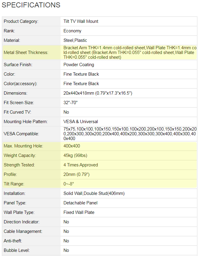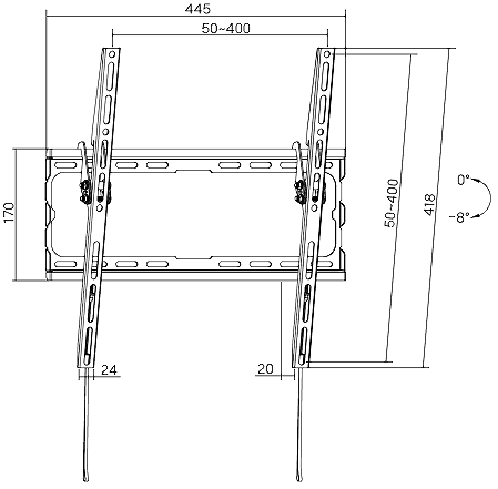 - ช่วยให้คุณวางทีวีในมุมมองที่เหมาะสม ช่วยลดแสงสะท้อนหน้าจอทีวี และยึดทีวีของคุณได้อย่างปลอดภัย ปรับมุมก้มได้ตั้งแต่ 0 ถึง -8° โดยไม่ต้องใช้เครื่องมือ