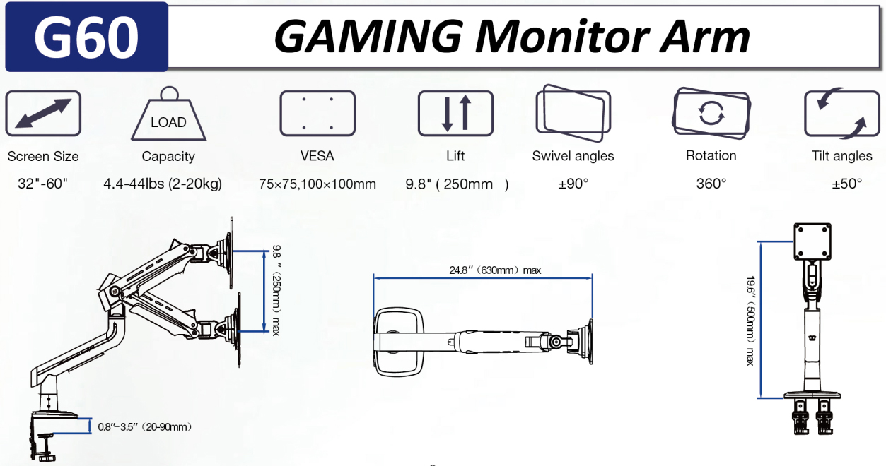 NB G60 RGB 32"-60" High-End Monitor Arm-Gaming ขาตั้งจอคอม ขายึดจอคอม แขนจับจอ Monitor แขนจับจอคอม(*ไม่รวมจอ),weight capacity 2-20 kg.