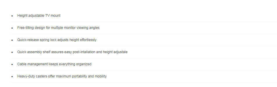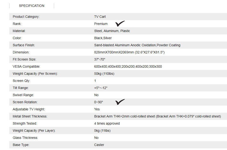 ENIX-F8300 Silver this single display TV stand with stylish, technical and functional design to provide solid presentation solution for most 37''-70'' LED, LCD flat panel TVs up to 50kg/110lbs (each bracket). Its flat panel TV brackets vertically allow effortless height adjustment of max. height of 2069 mm to match different viewing needs anytime. +5°~-12° freely tilting allows easy angle adjustment and reduces glare from lights or windows to obtain the optimal viewing comfort. Solid base provides additional security by removing the possibility of tripped over and ensures reliable performance for years of use. Internal cable management hides wires from view to keep a clutter-free appearance. Ideal for conferencing, public displays or other professional presentation.