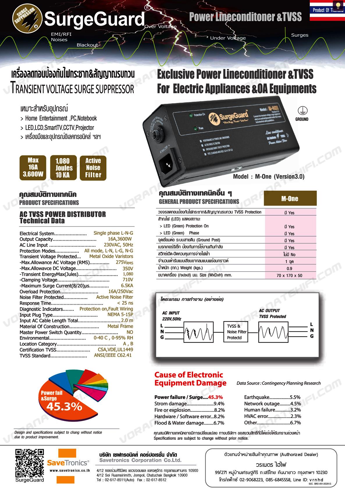 SurgeGuard M-ONE V3.0 *** รุ่นใหม่มีระบบตรวจเช็คความถูกต้องของระบบ ไฟ, กราวด์ และเฟสแสดงบนตัวถัง มีปลั๊กไฟ 1 ช่อง Power Capacity 3,ุ600 Watts/16A ทนต่อไฟ้ฟ้ากระชากได้สูงถึง 1,080 จูลล์ มาพร้อม Safety Breaker Switch ป้องกันการใช้งานเกินกำลัง ในชุดมีสายไฟ AC มาตราฐานขนาดใหญ่ 1.5 sqmm. ยาว 2 เมตรแบบถอดออกได้ เหมาะสำหรับปกป้องอุปกรณ์ประเภท Computer, OA, HomeThetre, Smart TV, เครื่องใช้ไฟฟ้า - อ๊เล็คทรอนิคส์อื่นๆ และ "เพิ่มความมั่นใจยิ่งขึ้นด้วยการรับประกันสินค้าแบบ Limited Life Time Warrantee"